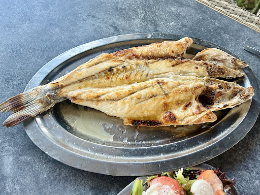 However, we ordered fish—after all, we were about a kilometer from the water. And that’s where our big surprise began. I don’t know if it was intuition or sheer hunger, but we started eating the served salad without waiting for the rest. Olive oil, some spices, lettuce, onion, and tomatoes. Simple and brilliant at the same time.