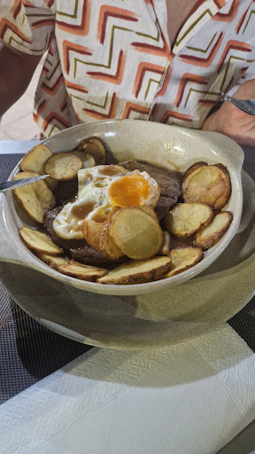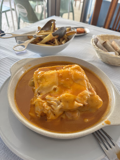 We went there specifically for one dish called a Francesinha. This is a traditional dish from Porto, not the Algarve, but we were informed the family who ran the restaurant were from Porto, and they specialised in food from their home area. A Francesinha is not for the faint hearted and we know what we're letting ourselves in for. It is bread, with steak, topped with different types of ham, topped with several sausages, topped with more bread and more ham. Then another slice of bread then several hand fulls of cheese which is then put in the oven to melt then a fried egg is put on top. Then, the sauce is added, which is made from beer, mustard, and a secret blend of herbs. This is then served with a massive portion of French Fries. This is almost like the ultimate Porugese food challenge. We went in hungry and have not eaten from the day before and ordered one between the two of us. It nearly beat us, but we did manage to eat it all. Felt pretty stuffed the next few days but enjoyed the food. It was a challenge, and I had always wanted to try one and really pleased we did it. I must point out how helpful and pleasant the staff were. Although, in most family run restaurants, they are really friendly. Here they were super friendly, particularly the lady...