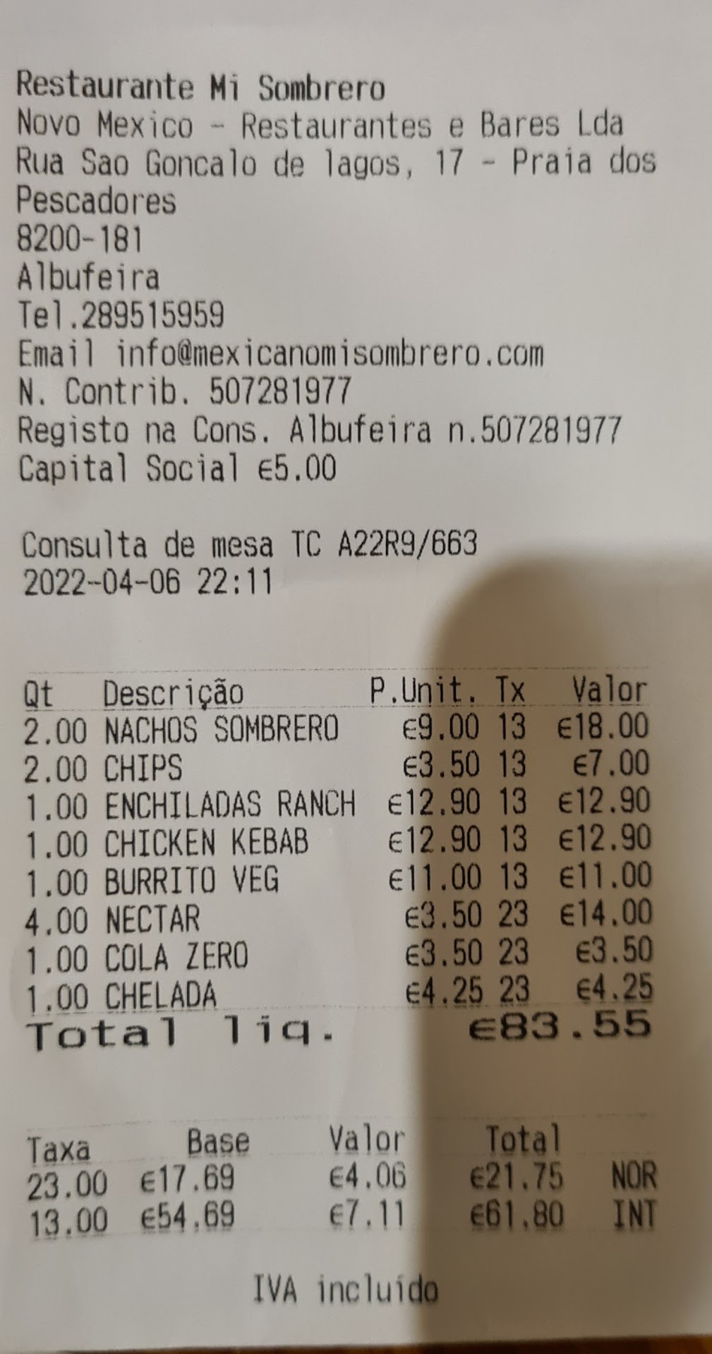 Read moreAVOID AT ALL COSTS!!! As I'm writing this review I'm still pulling out the chewy chicken stuck in my tooth. 2 adults, 2 teens and 2 children dining experience. Starters, average for the price you pay. Mains, 5 out of 6 meals were average. The 6th meal, mine, chicken fajita, the chicken was dry and chewy, 5 out of 6 meals edible, so not too much of an issue, until I called a member of staff over to tell them about the chicken, he never spoke English so called the 2 owners, told them the chicken is dry and chewy, they both laughed at me, their response, ' I've sold loads today, not 1 problem, your being awkward, you don't want to pay'. All I expected was for them to offer me a replacement or another option, instead they went over to another table and asked them 'How was your chicken fajita today', loud so that I could hear. This was getting quite embarrassing now. I have my own catering business, so I believe I know my food. Told them I'm a chef and they laughed at me, in front of my family and other diners. Explained to them that we've ordered all this food, we're not happy with 1 item and you can't take criticism. They took my meal away from me in anger and muttered to themselves in Portuguese, something about the British. Never in my life have I ever experienced the owners of a restaurant laughing in a customers face and get angry over criticism. The food by the way was below average and well overpriced. Pic of my receipt attached, so this is a genuine...