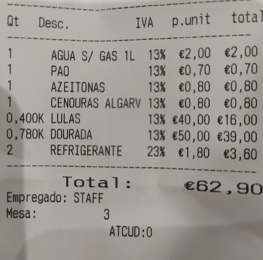 Read moreFood is good but for a snack-bar very pricy. 68€ for only 3 main courses + 2 soft drink and 1 wine is way overprised for a typical Portugese snack-bar. And yes I have been coming to Portugal allready for 7 years so I do know howmuch other places ask for the same course. Once again the...