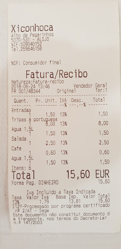 Read moreRistorante semplice con cucina tradizionale portoghese di ottima qualità. Abbiamo ordinato dal menù delle trippe alla portoghese, con fagioli e una pirofila di riso da aggiungere alla pietanza, servita a parte; pane e olive; due insalate miste con lattuga, pomodori e cipolla; due bottiglie d'acqua da 1,5 l e due caffè espressi, per un totale di 15,60 euro. Rapporto...