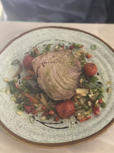 Read moreWe had a wonderful experience here. We had the couvert with some extra bread for the tasty pâté and garlic butter that came with it. Tuna tartare to start was excellent. My wife had the teriyaki salmon with sweet potato purée and pak choi and I had the stew with cod, shrimp, peppers, potatoes and pennyroyal. They recognized our orders were taking a while to receive and apologized and delivered another bottle of wine to our table on the house. When our orders arrived, both were only slightly warm. We just ate quickly as we were pretty hungry at this time, plus the dishes were delicious. For dessert we shared the sweet rice with cinnamon. This dish came cold which was fine, it was tasty, we just expected it to be warm as most rice pudding desserts we've had before have been warm. We also had an americano and espresso with dessert. A little challenging getting into the restaurant with the hills and stairs, but that is what you get around Lisbon! The walk is worth it for the view of the sunset behind the bridge over the river! Glad we booked this in advance as people were lined up to get in without reservations. Definitely recommend if you are in the Lisbon...