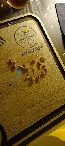 I ended up finishing the other half of the burger myself and found what you can see in the photo… even bits of skin showed up. It’s a shame, because the restaurant seems to have potential, but the overall experience was very disappointing.