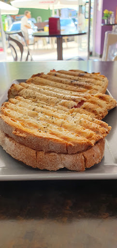 Comida Oferecem bolos, tostas, pequenos-almoços e torradas. Experimentei a torrada de pão alentejano — embora não fosse o típico pão rústico alentejano, estava saborosa.