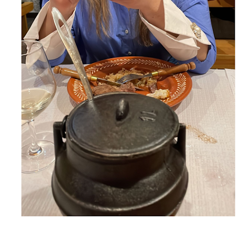 Admittedly, my Portuguese is not up to snuff but I had my Rick Steves phrase book with me and it proved to be, well, not quite enough. After a few moments of fumbling in broken “Engloguese”, the waiter decided that it was best to recruit his friend sitting at a nearby table who was fluent in English, so that’s how we carried on with the order. I asked the friend what his favorite items on the menu were and he quickly pointed out the grilled chorizo for an appetizer. For the entree, he said the steak and fried cod in tomato sauce with a side of rice and beans was a real traditional Portuguese meal. To wash it down, I ordered the vino tinto - verde style - which came in a cup and not a glass. The wine was served chilled and it was slightly effervescent.