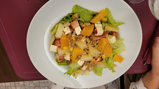 I rarely write negative reviews but if I could give the food here 0 stars I would, the one star was because the service was alright. I orders the chicken salad that boasts fresh fruit but what I received was canned pineapple and cut up canned peaches, tomatoes and cold processed chicken (at least it had a little flavour) despite the fact that there were fresh oranges behind the counter and melon in the display. This could have been so much better if made with real ingredients. My partner ordered spaghetti bolognese and it was a runny cream tomatoes sauce, at least it had fresh mushrooms. It was also expensive for the quality. Save yourself and go somewhere else...
