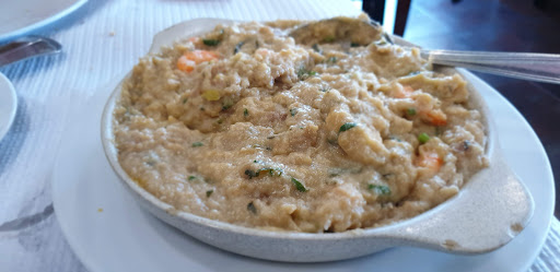 Read moreDesastroso! Entrei porque tinha um ecrã todo XPTO no exterior a dizer que o prato do dia era arroz de lingueirão, mas afinal já não havia. Eram 20:30 quando pedi uma sopa de legumes e também já não havia... Pedi em alternativa uma sopa de peixe e se calhar também já não havia, a avaliar pela sopa de batata com migalhas de peixe que trouxeram para a mesa. Má demais! Pedimos um arroz de marisco e uns lombinhos de porco com batata a murro e fruta. O funcionário perguntou se a carne (PORCO!!!) era bem ou mal passada... Na esperança de não morrer por comer carne de porco crua, pediu-se bem passada. Mas afinal bem passada era igual a passada demais. Batatas secas que o azeite está caro. Já a suposta fruta do prato era, nada mais nada menos, que um GOMO DE LARANJA E MEIO PÊSSEGO DE LATA. O arroz de marisco estava razoável de sabor e trazia marisco suficiente. O que não se percebe é por que motivo, sendo uma marisqueira, não sabem arranjar o marisco que metem no arroz. Martelar sapateira e mete-la dentro do tacho sem remover os "estilhaços" das cascas resulta numa experiência MUITO desagradável. A cada garfada de arroz lá temos de andar a tirar cascas da boca ou a fazer esforços mirabolantes para não partir um dente. Ficámos sentados ao pé da cozinha e o barulho era ensurdecedor. E ainda tive oportunidade, que dispensava, de ouvir um dos funcionários das mesas a dizer um palavrão, alto e bom som, ao passar ao pé da nossa mesa onde estava uma criança...