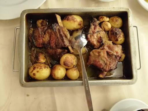 Duo de costela mendinha e cabritinho assado, sublimes, assados no ponto, macios, saborosos, crocantes, tudo ao mesmo tempo. E que bem que convivem os dois, aconchegados por uma saborosa castanha e uma gulosa batata assada. A acompanhar, os grelos, a saber a grelos, e o arroz de forno que, viciante, é sempre pouco, e sempre a pedir mais uma regadela com a cama do assado.
