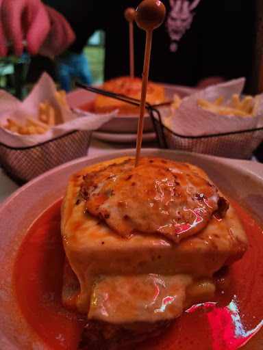 Visitamos o restaurante num domingo à noite, sem reserva. Não esperava uma experiência memorável, só queria aproveitar o pouco que restava do fim de semana e comer alguma coisa rápida. Optámos por uma francesinha e um hambúrguer no bolo do caco com molho de francesinha. Para beber, pedimos uma Super Bock e uma Somersby.