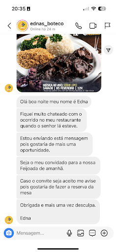 Olá! Até este momento eu pessoalmente não firmei reclamação alguma ,mesmo que um grupo de colegas que esteve no local uma vez ,onde eu também estive , o fizeram , eu particularmente relevei alguns ocorrido deste dia , até porque até então eu gostava do local e da comida , o atendimento infelizmente sempre deixaram a desejar, mas relevei por algumas vezes,mas depois de algum tempo sem ir até o restaurante ,resolvi pedi uma refeição para meu filho (almoço, parmegiana ) fiz o pedido as 13:36,previsão de entrega era para 14:07 , meu filho sairia para trabalhar as 15 horas, e infelizmente até as 15 h a comida não havia chegado,e desta vez foi a última tentativa de esperar por uma retratação decente por parte do estabelecimento ,que por 2 vezes eu ao ligar para o mesmo e o menino primeiro me disse que n havia meu pedido, no sistema, depois perguntou se era feijoada, liguei depois ter de passado o horário da entrega ,pois precisava cancela o pedido pq n iria poder esperar mais ,com atraso de mais de 1 hora,no suporte do app,tmb n resolvia,e o menino então disse ,olha n temos estafeta ,depois de então encontrar no tal sistema o pedido, eu então pedi para fazer cancelamento ,pois eu não conseguia, e não ter estafeta não eh problema do cliente , com descaso total ,ele me orientou rsrs,olha a senhora se tiver chovendo não faça pedido ,pq na chuva os estafeta não vem ,eu então disse ,antes de tanto transtorno, o restaurante que deveria não abrir o aplicativo de entregas ,o cliente n vai adivinhar que a comida não vai ser entregue no tempo, e por fim não cancelaram meu filho ficou sem almoço, e as 15:10 entregaram a comida fria completamente fria ,horrível, uma vergonha tanta falta de respeito e descaso, mas eu acredito que a senhora Edna ,não estava neste momento ,pois não é possível que ela iria permitir tanto descaso , acredito que não, mas precisa ter proficionais mais bem instruídos, mas capazes de resolver essas cituções na ausência dos responsáveis ,gosto sim da comida , e do local,mas espero não precisar mais ,em nem um momento do restaurante como um todo ,não quero mais fica decepcionada com tamanho descaso...