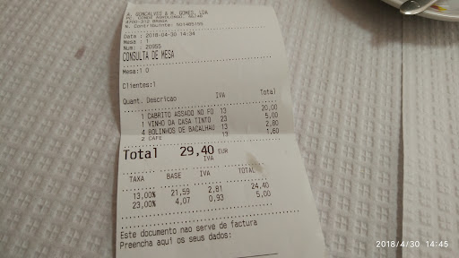 Read moreNão gostámos do atendimento inicial, que nos recusou logo à partida uma possibilidade de nos sentarmos onde desejávamos (uma mesa ao canto, numa sala aquecida) tendo-nos remetido para outra sala. As mesas para 2 pessoas estão em sítios de passagem, sujeitos ao frio e às naturais movimentações. A sala onde acabámos por ficar era grande, mas fria e desconfortável. O atendimento foi rápido, até demais - estávamos nas entradas chegou a sopa, estávamos na sopa, chegou o cabrito. Sopa muito boa, mas cabrito, apesar de saboroso, era aquecido e veio em dois pedaços enormes, sem grande apresentação e sem o habitual acompanhamento de salada. Tivemos ainda o azar de ter um grupo enorme de pessoas junto a nós, o que nos impediu de comer tranquilamente e ainda piorou a experiência. Os preços são um pouco altos para a qualidade oferecida. Percebemos a tradição da casa e a simplicidade do seu funcionamento, mas já comemos melhor em Braga, ficámos desiludidos e não...