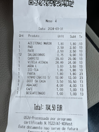 Read moreDona do espaço super arrogante Um almoço para 22 pessoas comida não chegou... Muita arrogância na hora de atendimento. Não passou fatura Não aceitou pagamento por multibanco e ainda pediu para que o mesmo fosse pago em dinheiro... 910€ em dinheiro sem fatura? Não tem Multibanco... Uma roubalheira falta de profissionalismo e pior é até negarem uma fatia de gelado... 910€ paga o gelado inteiro... Já para não falar que nem sobremesa tinham que chegasse para todos... Pior foi confrontar a dona e a mesma ter a lata depois de tudo isto ainda dizer não ia estar a fazer 20mousse de chocolate... Ridículo
