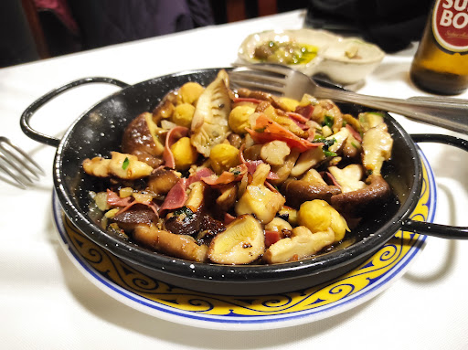 De primero, shitake sin jamón, ya que mi pareja es intolerante a la histamina de los embutidos. Indudablemente, nos trajeron las setas llenas de jamón. Le indicamos a una segunda camarera, encargada intuyo, que le habíamos pedido el plato sin jamón. A lo que ella indicó que ahora salían unas setas sin jamón, como previamente habían apuntado. El ansiado plato, traía trozos de jamón, no muchos, lo cual, indica que que, a manopla los habían retirado. Primera mentira.