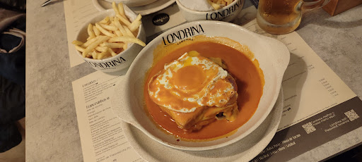 Read moreFrancesinha mediana. Estava à espera de melhor tendo em conta a "publicidade". Eles não assumem que a francesinha é acompanhada por batata frita por isso é necessário referir isso (não é muito habitual). Acaba por ficar muito caro com batata à parte. O molho é espesso mas demasiado artificial no sentido em que tem um intenso sabor a natas. Um empregado de mesa foi mal educado quando lhe estávamos a fazer um pedido...O pedido, como é óbvio, só demorou uns segundos mas repetiu "diga", "diga", "diga" com um ar nervoso....Acredito que estivesse muito apressado e o restaurante estava cheio...mas o cliente não tem culpa e sem pedidos não se faz negócio. Aliás acabou por não trazer nada, esqueceu-se.... Nesse caso terão de rever o número de empregados em determinado horário. Depois dessa situação houve um segundo esquecimento por parte de outro colaborador. Ou seja, e como diz o povo,"come-se" a francesinha mas verdadeiramente nada de especial e muito longe da qualidade de outros restaurantes, até dos pouco conhecidos e com francesinhas muitíssimo...