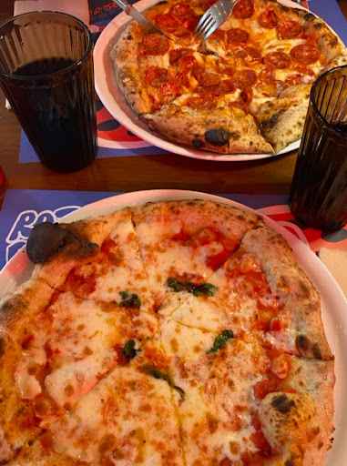 Delicious and well thought, interesting combinations of pizza flavors, like the PepperHoney and Ham and Jam (2 of our favorites). The dough is a lovely thin crispy crust cooked in a wood fried oven.
