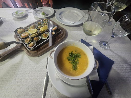 We started with the fish soup, which was creamy, rich, and full of flavor. Next came the limpets, served with butter and garlic—simple yet absolutely delicious. For the main course, we had the Cataplana de Peixe, a seafood stew with fish, shrimp, and limpets, accompanied by rice. The sweetness of the onions balanced the dish beautifully. Though it’s listed as a portion for two, it could easily feed a family of four!