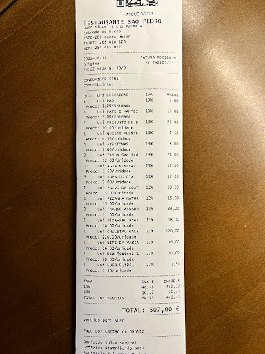 Total, comemos um prato de presunto, um queijo, um arroz para quatro pessoas e duas garrafas de vinho.