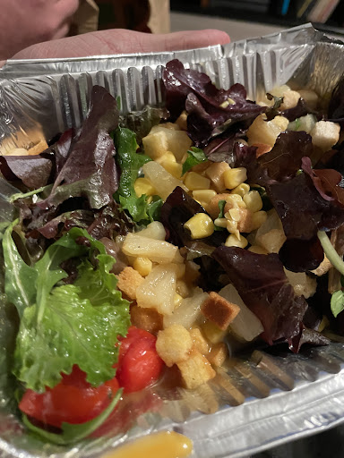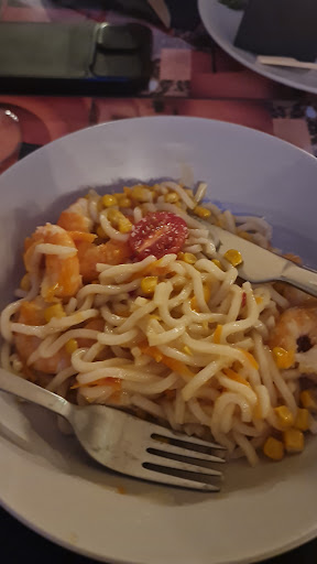 Pedi uma salada de camarão que, pela descrição, me parecia 5 estrelas. E por 14€ tem quase a obrigação de ser. Nem preciso de dizer nada para além da foto 😅 resumidamente: uma lata de milho, uma lata de ananás em calda, 4 camarões, 5 folhas de alface e tomates cherry da semana passada. E os croutons também devem ter sido certamente abertos pelo menos á uns dias.