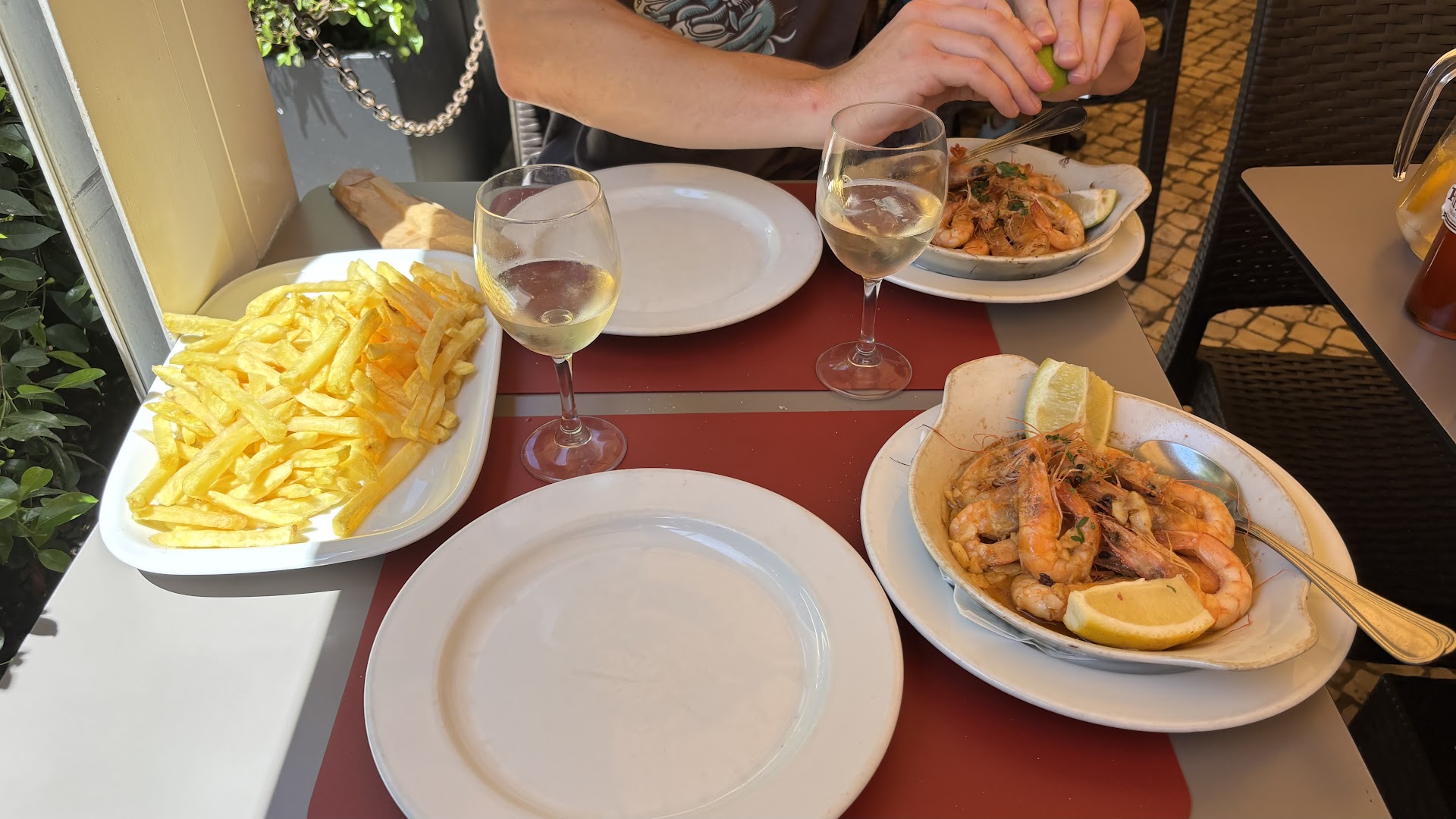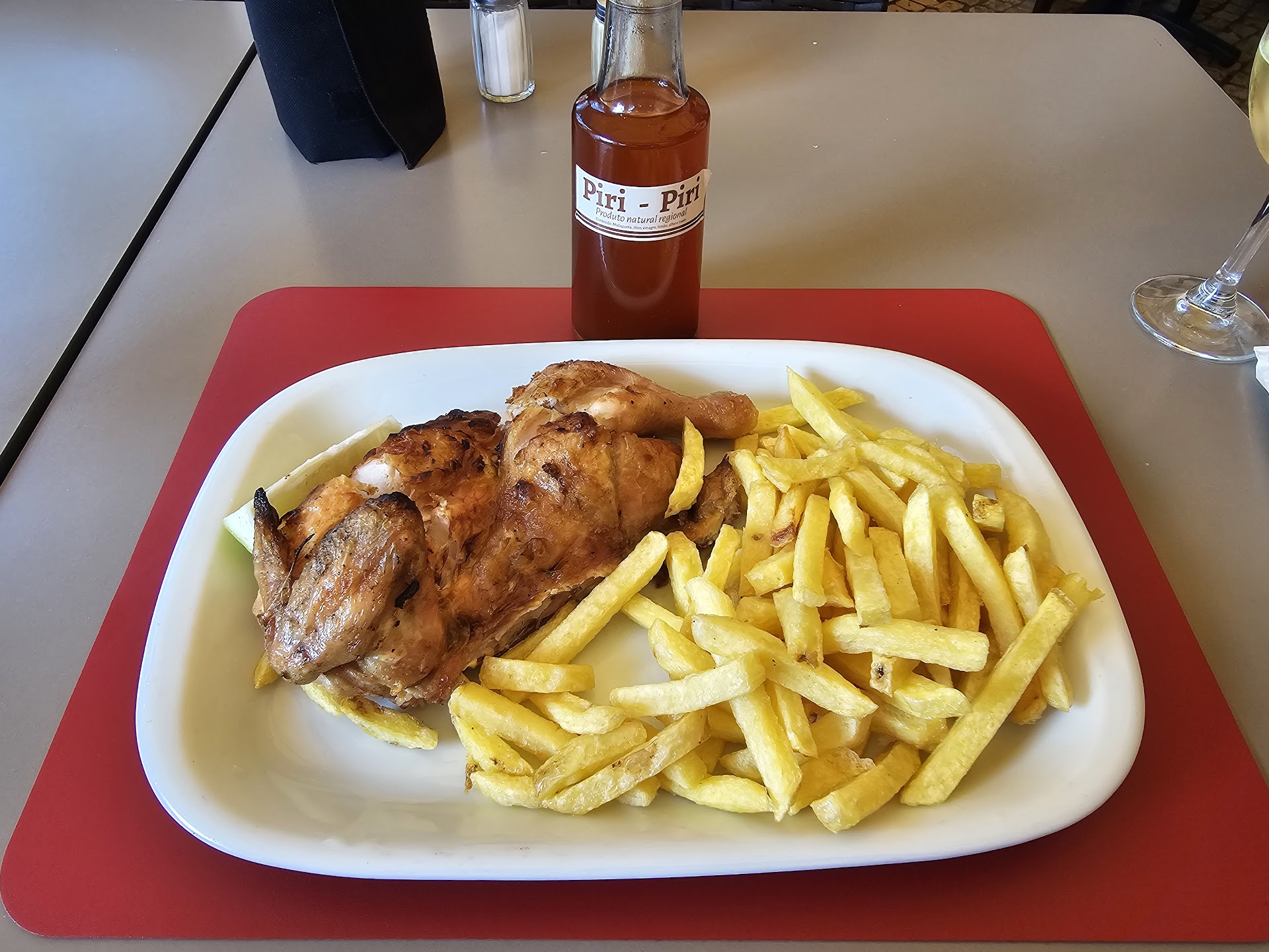 Read moreBusy restaurant on a busy tourist street. I was told before seated I could only pay cash, but I saw others paying with card so I paid extra attention to my bill. The waiter was kind of hovering, which I'm not used to in Portuguese restaurants Usually they let you linger and you have to flag them down for attention. Ordered the 1/2 roast chicken that came with fries and a half bottle of the house green wine. The chicken came out so fast I thought I was in a US drive thru. Pleasantly suprised though. The chicken was seasoned and cooked well. Good, made great with extra piri piri. The fries were just ok. The house wine (Arca Nova) was pretty tasty as far as house wines go. As I find all Portuguese dishes, the single portion is enough for two people. The value for the meal was reasonable (around 20€?) If I hadn't felt rushed or suspicious because of the cash only request I might have rated them higher.