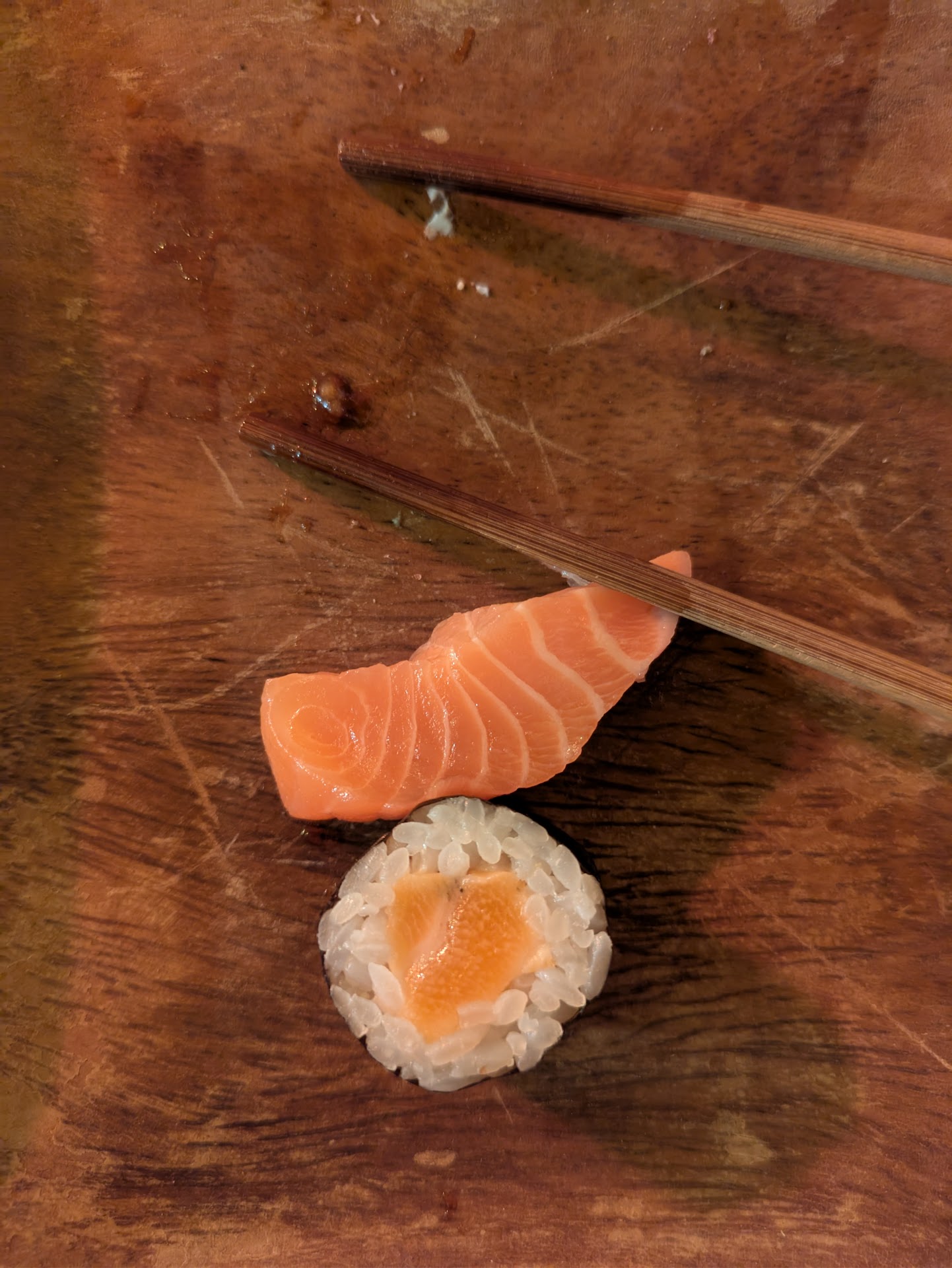 O hosomaki de salmão tinha uma cor e um sabor diferentes do sashimi de salmão, o que levanta dúvidas sobre a qualidade e conservação do peixe.