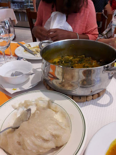 Saí do Restaurante com um misto de sentimentos, por um lado a muito boa confecção da Cozinha Angolana. Muamba de Galinha com Quiabos bastante saborosa num molho consistente e acompanhada por Pirão de Milho Branco e Funge de Mandioca, paladosas e de boa textura. Veio também uma Cabidela ao Estilo Angolano com Quiabos e Funge, Cabidela essa bem avinagrada. As doses são em quantidades generosas. O pão é bom, tal como os Salgadinhos o Queijo e as Azeitonas. De sobremesa também uma boa Delicia Folhada com Doce de Ovos. O mau de tudo foi o elevado tempo à espera, cerca de 1h15 à espera da comida sem aviso prévio dos colaboradores ou da gerência que seria um prato que podia demorar, o que disseram depois de alguma manifestação de desagrado da nossa parte foi que tinham poucos bicos no fogão. Um prato considerado a especialidade da casa e realmente de boa confecção não pode demorar mais de 1h a...