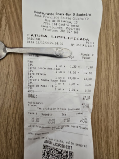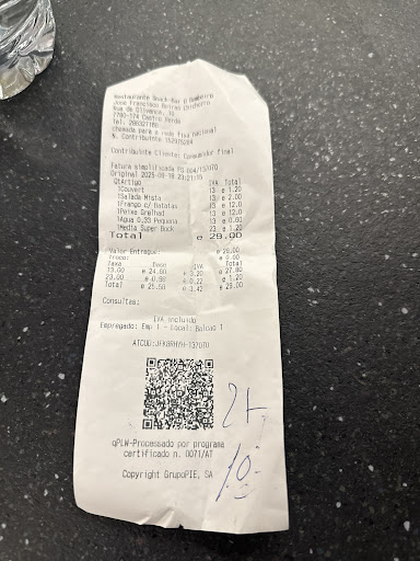 Read moreLlevamos muchos años viniendo a Portugal y nos encanta el pais, por eso nos da mucha rabia cuando se intentan aprovechar del turista , que es exactamente lo que nos paso en este sitio. Es un sitio humilde como los muchos que hay en Portugal que se come genial a precio económico, pero en este caso todo lo contrario. Nos atiende una camarera muy mal encarada y nos dice que basicamente hay 4 cosas y que se les acabo el arroz; pedimos medio pollo (por cierto horrible y flotando en aceite como se ve en la foto) con 4 patatas y obviamente sin arroz y media de salmon con dos patatas cocidas y una zanahoria… y directamente con toda su cara nos cobra un pollo entero y una de salmon entera. Cuando me quejo me rebaja 2 euros sin ninguna razon… no tenia ganas de llamar a la policia y nos fuimos pero vamos que si eres turista no se...