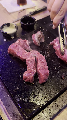 Quando chegamos ao local demos uma pequena vista de olhos ao menu na entrada, íamos optar por não entrar, visto que a maioria é só tapas, como era domingo queríamos algo com mais substância. Mas reparamos no naco que está na ponta do menu, ao qual dizem que só era servido durante a noite(20h-23h) ou ao fim de semana durante o almoço. Então entrámos, foi indicado uma mesa e depois de sentar fomos atendidos por um jovem que, apesar de muito simpático e de não ter culpa, nos indicou que não estavam a servir o naco pois só era servido à noite (mas era domingo). As pedras não estavam aquecidas e necessitavam de mais de meia hora para aquecer. Como já era 13:00h optamos por ficar e pedimos o prego no prato. Não era o que queríamos, mas lá fomos, depois de pedir as bebidas pedimos uns folhados de queijo da serra. O jovem voltou e informou que a cozinha avisou que os folhados iriam demorar 20min, ou seja neste restaurante é tudo preparado na hora e fresco pelo que reparo (massa do folhado, queijo, entre outros). O bife era finíssimo, a salada que acompanha é embalada, daquelas que se compra no supermercado e as batatas industrializadas. Ficamos decepcionados com o prego em prato. Também era de esperar pois a capacidade de 70 pessoas que o restaurante possuí, estavam 12 pessoas...