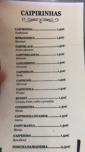 Read moreÉ um cafe/bar muito bom, o dono- senhor João - é uma pessoa maravilhosa, super simpático, desde que lá fui pela primeira vez, ele sempre me tratou a mim e aos meus amigos muito bem, e educadamente. O melhor deste pedaço de céu são as caipirinhas, que além de serem a um preço bem abaixo do habitual, são saborosas, e o culminar de tudo é o rodízio de caipirinhas! Os meus sabores preferidos destas caipirinhas são mirtilo e pêssego, mas há muitos mais sabores! Aconcelho a quem não conhece passar por aqui, é um sítio escondido e difícil de encontrar, mas...