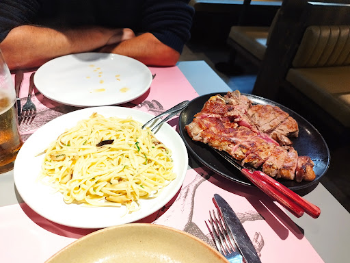 Read moreA decoração é o que se espera visto de fora, requalificado um espaço antigo com a decoração excêntrica alusiva ao nome do restaurante com detalhes interessantes e que enchem o olho. Cria uma expectativa que não se traduz nem no serviço, nem na comida nem no esforço de apresentação da comida e nem mesmo na bebida. Feita a reserva com intenção de não cair no risco de chegar a uma casa cheia, fomos colocados numa mesa que se assemelha a uma mesa de jardim onde é preciso puxar os pratos para o lado para que caibam pratos de comida e de servir, ainda que a sala esteja com uma lotação de menos de 50% com mesas mais espaçosas livres durante todo o nosso tempo de permanência. Lotação essa que pouco flutuou durante a refeição. Somos informados ao sentar que não se encontram a servir cocktails (ainda que de sala semi vazia) e ficam apenas as opções de cerveja Super Bock de pressão ou Carlsberg de garrafa, vinho, refrigerante ou água. Uma pequena desilusão dado que o bar ocupa a parte central do estabelecimento e é a primeira coisa que vemos ao entrar e a carta de cocktails faz parte da carta de refeição. Pedida a entrada, boa, não espetacular, mas a simplicidade saborosa a que a comida italiana nos habitua, composta por vários tipos de pão, tomates assados e pesto rosso. Finalizada a entrada informam-nos que o prato que escolhemos não pode vir como pedido uma vez que não têm o acompanhamento (linguini de alecrim) e sugerem um gnocchi ou pasta al aglio e oglio em substituição ou podemos escolher outro prato. Optámos pela pasta, dado que o original seria com linguini também. É-nos servido um T-Bone no ponto pedido, mas pouco temperado, quase nada. Não fosse a qualidade natural do corte não haveria muito de bom a dizer sobre o prato. A massa estava um pouco cozida de mais, embora al dente não seja o meu favorito, o alho estava demasiado torrado deixando o amargor do alho que passou da caramelização, a poupança no sal também se reflecte na massa. Ambos os componentes servidos em pratos de comer sem o mínimo esforço de empratamento, destoando totalmente da decoração que nos envolve. Uma simples taça em vez de prato raso na massa faria não só a mesa, já pequena, menos apertada, como um aspecto mais apelativo para uma refeição que parecia ser uma refeição de dia de semana atarefado em que o foco é pôr comida na mesa, não fosse o prato ter cor não se distingue muito do serviço de uma cantina. O T-Bone também apresentado num prato raso de refeição, carecia de um simples montinho de sal para que se pudesse ajustar a gosto ou apenas para mostrar algum cuidado, indo mais além, um pouco de pimenta ou um quadradinho de manteiga de ervas que ligasse toda a refeição. No fundo, a tudo falta um pouco de cuidado, esforço em apresentar bem e em tornar apelativo, um limpar a cara a a refeição que não deixa nada de especial a recordar a não ser os preços da carta. Preços elevados para o tipo de cozinha que é, especialmente para o qualidade do que é servido. Mas que não se confunda, um preço mais baixo não iria mudar a opinião sobre toda a refeição, a qualidade é mediana e a experiência fica muito aquém da expectativa. A qualidade das fotos é proporcional ao entusiasmo.