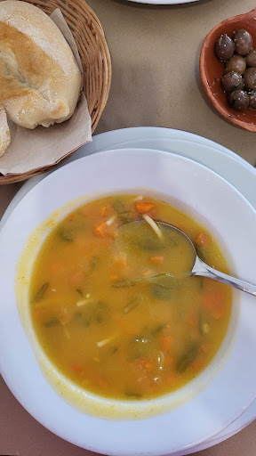This place is busy and we know why!! We showed up on a Saturday afternoon around 2:30pm (14:30) and there was a line outside to be seated at a table indoors. The restaurant is small to medium, seat maybe 40 - 50 people and all those tables were full. Of locals!! Yay! If the locals are eating at a restaurant that we show up at we get very excited because we know the food will be good. And we were right again!! We were lucky enough to be a party of 2 and we're seated almost immediately. The larger parties of 4 were seated shortly after. The chef came to our table and much to our surprise spoke English. She proceeded to decribe the dishes that were available. She took our drink and food order personally and then flew back into the kitchen. Modifications to the order were totally accepted. Drinks arrived quickly and then we enjoyed watching families of multiple generations laugh, chat like only the Portuguese do, and enjoy their lunches and amazing desserts. My chicken noodle soup arrived and it was delicious. I wasn't sure if it would be tasty when I first saw it because the broth looked quite watery and clear but boy was I wrong. Lots of chicken flavor in the broth, and chicken and pearl barley in the bowl. I gobbled it all down! They brought bread and olives to the table as well.