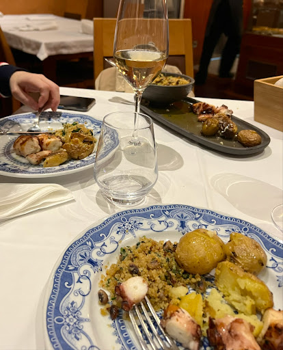 This restaurant has classy decor, impeccable service, and great food in several nice bright rooms. Main courses seem expensive until you realize it's enough for two people (maybe order half portion if not super hungry or taking the rest away). I had the house speciality of roasted goat with potatoes, a dry red wine from Douro Valley recommended by my server and the seafood bisque, as a starter. I finished with the house made cake (forget the name but it was great). All dishes were exceptional though the bisque maybe not such a standout (still good though). The portion of the main course was gigantic! Waiter was cheerful and helpful with suggestions and made up the remainder of my main course for me to take away. Most of the seafood dishes looked quite expensive (did not have one myself), but I would guess the portions are quite large and probably enough for two. They seem to specialize in goat and lamb as well as seafood. I highly recommend this place if you are in Coimbra and want to dine someplace on the higher end with a friendly, casual atmosphere and good, traditional Portuguese food. It would be particularly good for groups or couples who...