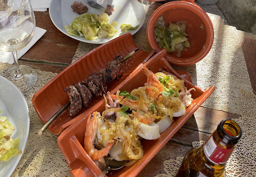 Very friendly personnel. When we arrived the kitchen had closed for mid day break. They offered to serve us what they could at that time. The 2 dishes we ordered were excellent. The cod fish was served with a smoked meat burger that I thought was fish. Great taste and combination. Served with the vegetables it was a full course meal. The pork and pawns sounded peculiar but once we tried it we could not stop eating. It had a rich gravy made from the meat broth and wine which combined delicately with the fine tasting grilled prawns. We ordered a big green salad, french fries that were cut round discs extra bread for the Devine gravy 4 bottles of beer and a glass of Verde wine (sparkling fresh wine) and paid 54âŹ. They also treated us to a local liqueur. Great tinny little place loaded with taste, good service...