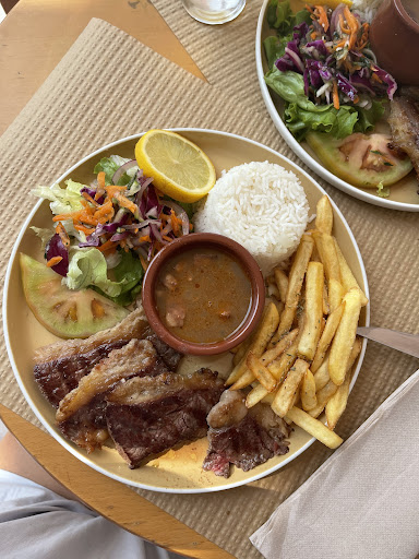 Read moreEstou desiludido. A comida é saborosa, mas as doses são algo pequenas - é um bom local para almoçar se a fome não for muita. Mas houve duas situações que me deixaram descontente: Ao almoçar num destes dias, pedi pão, e trouxeram-me três pequenos nacos de pão num pires. Como não chegava, chamei a menina e pedi especificamente "um pão!" - voltou a trazer-me novamente três pedaços de pão. Hoje almocei "espetada de lombinho com abacaxi" acompanhado de batatas fritas, arroz e salada. Qual não é o meu espanto quando vejo que em vez de quatro pedaços de carne e abacaxi na espetada, vêm dois pedaços de carne e duas batatas assadas (quando já tinha batata frita de acompanhamento). A sério? Saí com fome, e não...