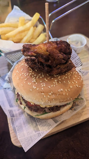 The food was good and quite fast. It was interesting to have the chicken wings on top of the burger but inside there were so many intense flavours that got a bit mixed up and you end up not really tasting each ingredient. Fries were good and crispy and the homemade sauce was good.