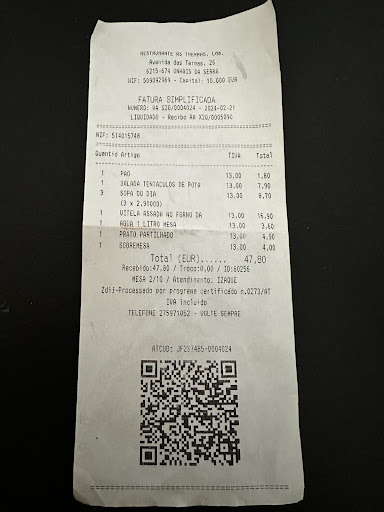 We've lived in Portugal for a few years now and travelled around a bit. Definitely among the best dining experiences we've had. We ate a stew of boar with beautiful roast apple stuffed with raspberries, a good steak and chips for our son and for starters the standard platter of Serra da Estrela cheese and various cured meats. Beer on tap was ice cold. Considering the rather upmarket setting (for us anyway, we don't go to expensive restaurants!) the prices were very reasonable, with mains in the mid-teens. It's a wonderful place to reward yourself after a walk on the nearby and stunning trails past the spa hotel next door. Oh, and if you want to part company with €1,000 for a bottle of wine, they'll oblige you. We paid around €75 for a meal for three,...