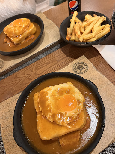 Read morePIOR FRANCESINHA QUE EU COMI NA MINHA VIDA INTEIRA. O atendimento é bom, os funcionários são simpáticos. Começamos, os pastéis de Leitao são bons e claramente a melhor coisa que que comi lá. No entanto pedi uma francesinha de vitela (ponto médio da carne)com queijo da serra. Pior erro. Uma casa com o nome de “francesinha” que de francesinha tem pouco. O molho mais parece uma sopa da semana passada. O queijo tem um sabor demasiado forte para o tipo de comida que é. A acompanhar, pedimos sangria espumante com frutos vermelhos, para variar não estava nada de mais, pouco doce e demasiado gaseificada. De sobremesa escolhi um tiramissu que claramente passava melhor por gelado com chocolate em pó por cima. Quem me acompanhava pediu um bife com cogumelos, estava ok , provei e não tenho nada para apontar. E de sobremesa pediu uma mousse de oreo, não provei, mas disse que estava boa. A conta foi 52 € preço este que para a qualidade da comida deixa muito a desejar. Não recomendo. De todos os restaurantes que experimentei durante as férias este...