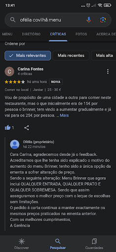 Acrescento ainda que eu e a minha companheira fizemos questão de ir ao Ofélia hoje porque tínhamos em boa estima e consideração o estabelecimento e era uma data especial, sendo que não foi a primeira vez que lá tínhamos ido, e lamentamos que as nossas impressões do Ofélia tenham sido manchadas hoje...