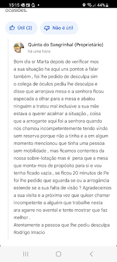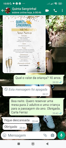 Acabamos de passar a passagem do ano nesta Quinta. Dou * pelo atendimento, comida e simpatia. Não posso nem consigo admitir falta de honestidade. Quando reservei o Senhor ao telefone disse me o preço por adulto, depois por mensagem de WhatsApp perguntei o preço para criança de 10 anos e disse. Quando fui a pagar o Senhor disse o valor que foi o valor do adulto alegando que o meu filho comeu 2 pratos e não 1. Eu falei com o Senhor e disse lhe que ele na mensagem não me disse as condições do valor da criança e mesmo assim paguei o valor do adulto quando o meu filho nem sequer comer nem para um peço nem para outro mas fui na mesma pensando eu que iria pagar o valor contratado. Ou seja, o meu filho pagou o valor do adulto só porque comer os 2 pratos, se comesse 1 mas esgotasse com o stock de bebidas e com as sobremesas e com a comida que estava depois da meia noite, já pagaria 25€!!!!!!!!!!! Um conselho ao Senhor da Quinta: um bom empreendedor não faz este tipo de situações. Este tipo de situações leva a que á desconfiança e falta de civismo. Não foi de todo bom não ter admitido o erro de não ter esclarecido antes o preço de criança. Não voltarei nem irei recomendar. Bom ano!