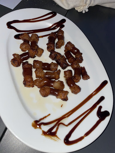 Comida en general muy rica...aunque quizás abusen un poco del aceite y el cilantro. A mí particularmente me gusta mucho el cilantro, pero entiendo que no pueda ser así para todo el mundo. Quizás hay demasiada presencia y sobre todo, en demasiadas cantidad, en cilantro. Tanto Felipe como la chica rubia que nos atendieron eron muy amables con nosotros. Estábamos viendo un partido de fútbol en el móvil y enseguida Felipe dijo que nos lo podía poner en la tele del salón. Estuvimos en una pequeña sala acristalada en la calle para nosotros diez, muy agusto. Aparte de los entrantes que ponen ellos en Portugal y que consumes, pedimos al centro dos de pulpo a la brasa, dos de bacalao dorao, dos de salchichas roja a la brasa, una sopa del día (que no trajeron y que, por cierto, no sé si nos la cobraron). Después de los entrantes, pedimos 9 platos (éramos 10 personas, pero dos personas compartieron un plato). Dos botellas de vino blanco y varias consumiciones (cervezas, refrescos y dos botellas de agua grandes). 5 postres y 7 cafés. Al final el precio por persona dividiendo entre 9 personas (la décima era una niña de 8 años) fue de 40 €.