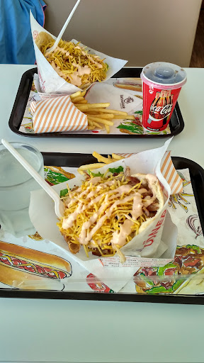 We asked for two falafel wraps in a menu to take away and payed for it. After waiting a good amount of time, the waitress told us they have no falafel and they could give us vegetarian hot dogs or hamburger instead. We asked them to cut the vegetarian patty in pieces and put it in the wrap instead of the falafel. We waited 30 minutes in total for our wraps and as we got home, we discovered there where cheese chili nuggets inside. They only have a spicy sauce or ketchup/mayonnaise for the wrap. The wrap was very heavy in the stomach and not yummy at all. It tasted like old oil and fish. The fries have been sloppy.
