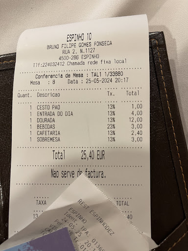 Read moreA qualidade da comida não é má, no caso do bacalhau assado apesar de a posta de bacalhau ser boa peca por vir queimada toda preta. Já no caso de uma dourada no carvão para duas pessoas cujo o valor apresentado é de 28,00€ e para uma pessoa 12,00€ não há diferença no peso do peixe. A dourada supostamente para duas pessoas tem um peso aproximado de 300 /400g e é servido em três pratos diferentes para tentar que o cliente não tenha a precessão. Num prato vem a dourada escalada sem a espinha e a cabeça com 4 ou 5 batatas á murro e nos dois pratos servidos aos clientes onde vão fazer a refeição vêm em cada prato uma parte da barriga da dourada. Seria mais justo apresentar o peixe numa travessa ao cliente antes de o escalar para grelhar e no menu apresentar o preço do Kg Para uma pessoa a dourada é suficiente e pelo tamanho sendo uma dourada de calibre 300/400g o valor de 12,00€ é aceitável. A grande questão é que tentam substimar a inteligência do cliente e fazer crer que é uma dourada para duas pessoas e faturar 28,00€ por um peixe de aquicultura de calibre 300/400g que o valor ronda os 5,00€ a 6,00€ Kg mesmo com o ganho para o restaurante o valor de 10,00 a 12,00€ ainda conseguia entender. A cara de pau de cobrar 28,00€ por uma dourada com o máximo 400g eu pergunto porque não colocam o preço do Kg no menu ? Se o peixe servido apresentava o valor de 28,00€ sendo como para duas pessoas, qual o tamanho do peixe para uma pessoa ? Uma petinga com o valor de 12,00€...