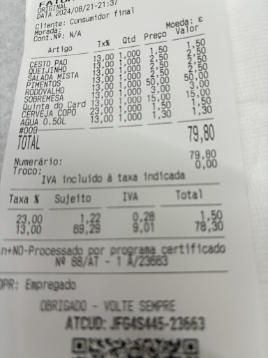 Read moreSinceramente nem dá para dar grandes comentários, muito mau atendimento, semtamos e veio alguém junto de nós e começa a debitar o que tinha, e quando lhe pedimos a ementa simplesmente diz que a ementa era o que ele estava a dizer, mas muito mal encarado. Obviamente levantamos e fomos embora. Não recomendo, existe outro na rua de cima junto à linha bem melhor. Não val apena entrar. Para quem conhece o restaurante, não se trata de acreditar ou não na minha crítica, apenas estou a relatar o que se passou comigo, nesta que foi a minha primeira e única visita...