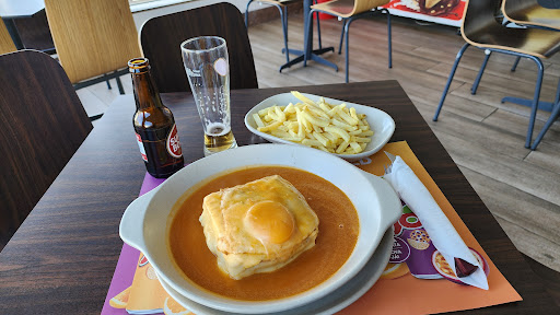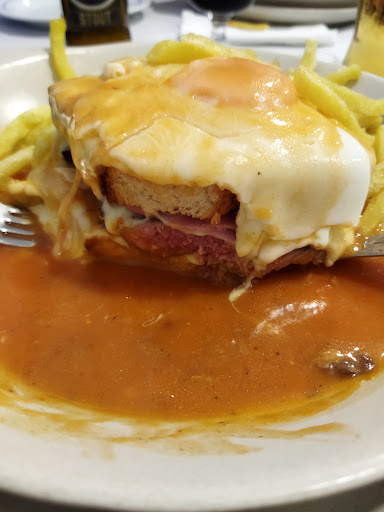 Read moreTraditional Francesinha of Portugal famous cusine was served with potato chips. It was very delicious with cheeses and bacon and beefs. It is heavy, but for good for Camino walker who needs good...