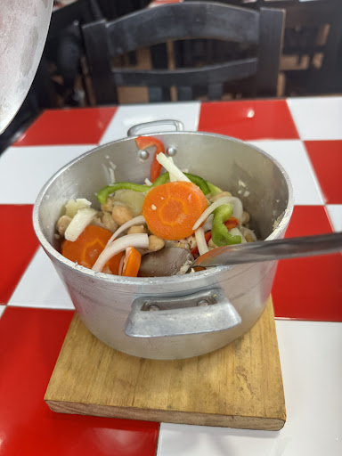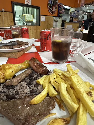 Read moreLogo a entrada, não me sugerem, mas dizem-me onde sentar, a casa estava praticamente vazia e tem duas salas, uma encostada à cozinha de onde saia um barulho imenso, aceitei relutantemente ficar na sala com aquele barulho de bater e limpar pratos da cozinha, como cliente gosto de escolher a mesa quando existem mesas vagas, afinal o meu dinheiro é igual ao de outro qualquer cliente. Servem a comida faz lembrar uma cantina, anda um funcionário com o arroz outro com as batatas a servir os clientes de mesa em mesa, pedi um frango éramos duas pessoas, chegou uma travessa com 3 coxas e 3 sobrecoxas, uma asa e costas de frango, pensei que seria frango de churrasco (o restaurante chama-se churrasquinho) era frango frito, no final o mesmo sistema com as sobremesas, anda um funcionário com um tabuleiro e assim as sobremesas frias, ficam quentes, comi uma mousse de chocolate que estava à temperatura ambiente"fui guloso" passei o dia seguinte a correr para a sanita. O preço é simpático, mas assim nem de borla, posso ter tido muito azar e na verdade já cheguei fora de horas passava das 14h, mas fica-me a ideia de que há restaurante que estão abertos não se sabe bem...