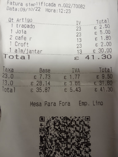 Read moreFui ao festival da gastronomia e pedi 2 menus supostamente 15€ cada, com tudo incluído, veio 4 pequenos bocados de vitela assada com bastante batata para encher o prato o vinho estava incluído no menu cobraram como jóia á parte, cafés á parte, a sobremesa pão de ló seco demais. O meu marido pediu um Martini com cerveja enquanto esperava pelo almoço trouxeram com cerveja morta sem gaz nenhum, cobraram 2,5€ por o mesmo, ainda bem que nem todos os restaurantes trabalham assim, parece que só quer o cliente para uma vez. Enfim experiência a não repetir, autentica...