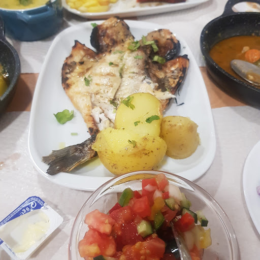 cheap tasty local food. Four of us had 2 beers 1 coke, pica pau vaca (sauteed veal), dourada fish, salsichas sausages(4 of them plus chips plus rice for 10euro!), camarao garlic prawns (6 good sized prawns for 10 euro); probably would not order the azietonas olives and pao bread again even though only 1.80 and 1 euro respectively, as they gave us toast with one of the meals (as well as two small salads). The whole meal cost a remarkably cheap...