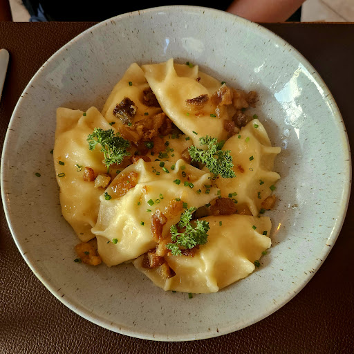As a person with polish roots I was curious and my companions also were in the mood for a different taste. We chose to go for a Couvert, Kulebiak and Oscypek as starters. The Couvert had a great lard and the little pickled radishes were amazing 😋. The Kulebiak was also very tasty, the rootbeet soup could have been more intense in my opinion. But it was still very good, no minus here! Oscypek was very delicious, probably my favourite of those three. As main dishes we had pierogi with cheese, one with truffle butter the other one with black pork crumbles. As a polish I have high standards when it comes to pierogi. They were good, and I recommend to try them. I wasn't overwhelmed but that's also hard in my case. Both toppings were tasty and harmonized pretty well with the Pierogi. We had 2 amaretto sour cocktails, which were really good! We had a cake (made with dates) with a salty caramel sauce and vanilla ice cream scoop on top, that really was amazing!