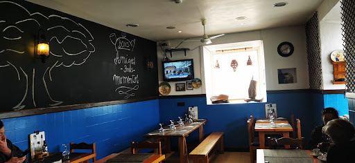 Read morePequeño local con decoración en color azul que contrasta con el negro de la parte superior de la pared que a modo de pizarra da mucho juego donde hacer dibujos decorativos, escribir frases o incluso apuntar el menú.
