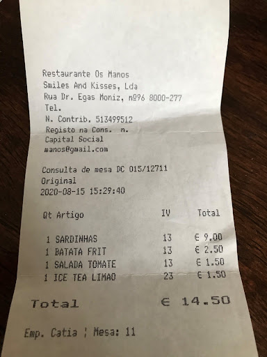 Read moreThis is the worst place that I have ever been for lunch. There is no waitress service, I needed to called him like 100 times to be payed attention for ordering. They forgot the drinks and brought the food before. And the worst thing, if you are tourist (non-portuguese) do not go there, I was totally cheated and tricked when they wrote in a piece of paper the bill (they do not have receipts!) and I was charged 71€ for 4 small fishes (they refused to show me the menu card!) It is was unbelievable disgusting staff! If you are tourist, please do not go, they will overcharge your bill. The worst...