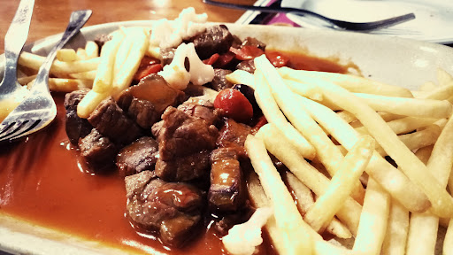 Darei uma estrela a este estabelecimento por dois motivos. O atendimento foi bom, e o naco(carne) estava bom, porém não dou mais estrelas. Pedi naco á minhoto. Fui servido com batatas á murro, que tinham sido feitas á horas atrás, estavam enqueijadas e notava-se serem aquecidas. Era pouca quantidade de comida servida para um prato de 11€. Passei fome, sinceramente não sei se dois pratos eram suficientes, já que o naco tinha quase o tamanho de 3 batatas...